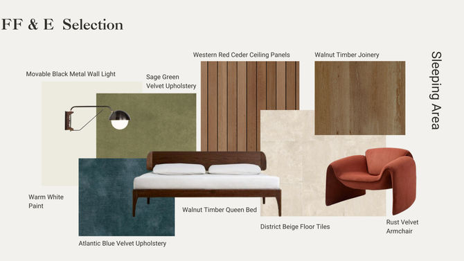Inspired by the surrounding Sydney environment, natural tones are speckled throughout the space such as yellows, browns and greens. This is intended to keep the space calm and provide a place of rejuvenation, bringing the outside in. Textures from materials like the Gleeze Giada green gloss tiles featured in the kitchen add interest and dimension to the space, keeping the eye simulated. Sage green and Atlantic blue velvet headboards are the main feature of the bedrooms with built-in shelving on either side. With its curves and soft touch, it brings a sense of warmth into the space.
